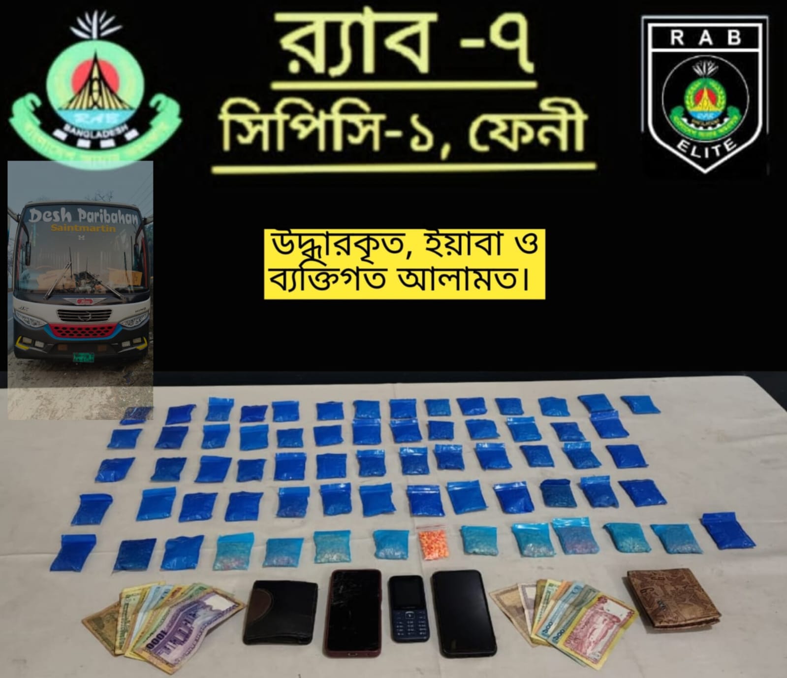 অভিযানের বিষয়টি নিশ্চিত করে র‍্যাপিড অ্যাকশন ব্যাটালিয়ন র‍্যাব-৭ চট্টগ্রামের সহকারী পরিচালক (মিডিয়া) এ.আর.এম মোজাফফর হোসেন এক সংবাদ বিজ্ঞপ্তির মাধ্যমে জানান, গোপন সংবাদের ভিত্তিতে অভিযান পরিচালনা করে ৫ মাদকরাকারিকে গ্রেপ্তার করা হয়েছে। তিনি আরো জানান, দেশ পরিবহন সেন্টমার্টিন’-এর একটি বাস যাহর রেজি নং-ঢাকা মেট্রো-ব-১৪-৫১১৯ এর পরিচালনার সাথে জড়িত ড্রাইভার, সুপারভাইজার ও হেলপারগণ পরস্পর সহযোগে মাদকদ্রব্য (ইয়াবা ট্যাবলেট) কক্সবাজার জেলা হতে ঢাকার উদ্দেশ্যে মাদকদ্রব্য বহন করে আসছে। উক্ত তথ্যের ভিত্তিতে গত ২৯ জানুয়ারি ২০২৬ইং তারিখ আনুমানিক ভোর ৬টার সময় ফেনী জেলার ফেনী সদর থানাধীন লালপোল ওভার ব্রীজের পূর্বদিকে অবস্থিত আমানত হোটেল এন্ড রেস্টুরেন্ট এর সামনে চট্টগ্রাম-ঢাকা মহাসড়কের পাকা রাস্তার উপর একটি অস্থায়ী চেকপোস্ট স্থাপন করে বাসটির জন্য অপেক্ষা করতে থাকে। চেকপোষ্ট চলাকালে বাসটি উক্ত স্থানে পৌঁছালে র‍্যাব সদস্যরা বাসটিতে থাকা অভিযুক্ত ১। মোঃ ইসমাইল(৩৮)(হেলপার), পিতা-মৃতঃ সিদ্দিকুর রহমান, সাং-কাদিরদিয়া, থানা-আড়াইহাজার, জেলা-নারায়নগঞ্জ, ২। মোঃ হুমায়ুন কবির (৩৩) (ড্রাইভার), পিতা-সিরাজুল ইসলাম প্রকাশ গুড়ামিয়া, সাং-ধনিজকরা, থানা-চৌদ্দগ্রাম, জেলা-কুমিল্লা এবং ৩। মোঃ রুবেল হোসেন (৩৫) (সুপারভাইজার), পিতা-আব্দুল মান্নান, সাং-টামটা, থানা-শাহরাস্তি, জেলা-চাঁদপুর’দের আটক করতে সক্ষম হয়। পরবর্তীতে বাসটির সিটের ভিতরে পলিজার প্যাকেটের ভিতরে বিশেষ কায়দায় লুকানো অবস্থায় ১৩ হাজার ৫৩০পিস ইয়াবা উদ্ধারসহ মাদক পরিবহনে ব্যবহৃত দেশ পরিবহন সেন্টমার্টিন-এর ১টি বাস জব্দ করা হয়। উল্লেখ্য যে, উদ্ধারকৃত মাদকদ্রব্যের আনুমানিক মূল্য প্রায় ৪০ লক্ষ টাকা।