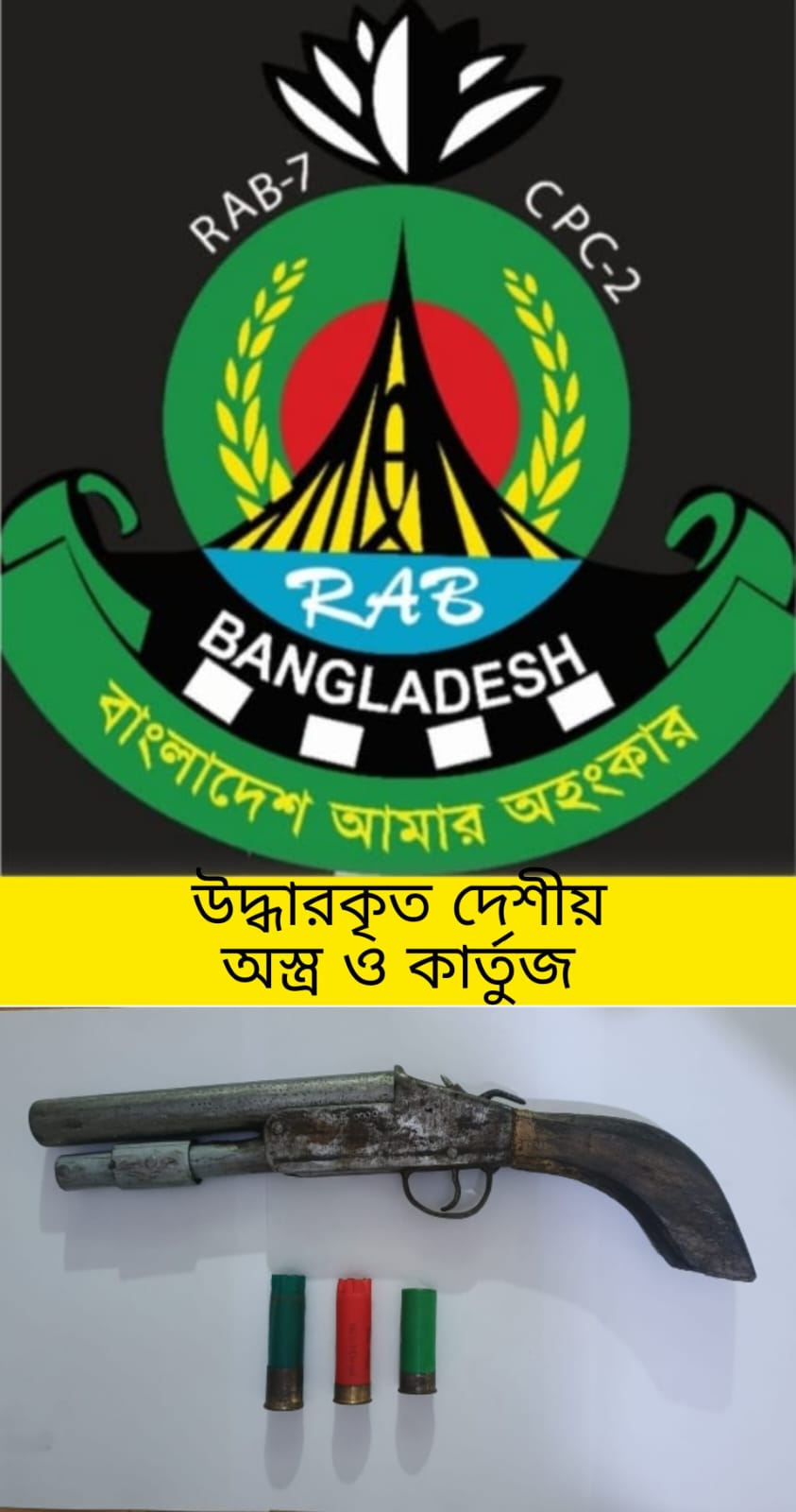 চট্টগ্রামে র‍্যাবের বিশেষ অভিযানে রাউজান থানাধীন কদলপুর এলাকা থেকে একটি দেশীয় তৈরী পাইপগান ও এক রাউন্ড কার্তুজ এবং দুইটি খালি খোসা পরিত্যাক্ত অবস্থায় উদ্ধার করা হয়েছে।