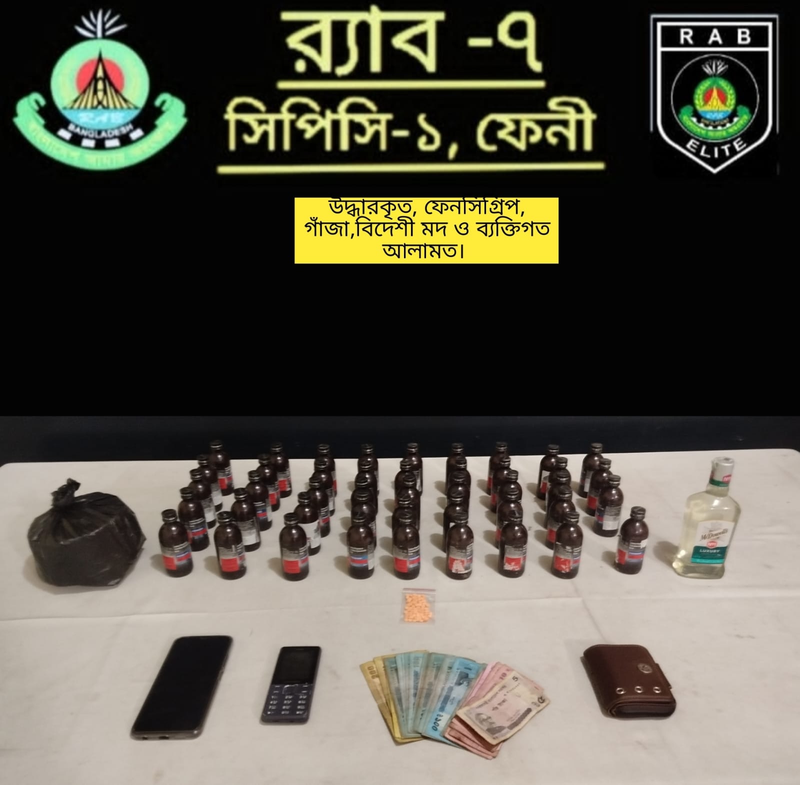 মঙ্গলবার (২৪ ফেব্রুয়ারি) আনুমানিক বিকেল সাড়ে পাঁচটার দিকে ফেনী সদর থানাধীন দক্ষিণ মাইজবাড়িয়া এলাকায় পরিচালিত ওই অভিযানে ৪৪ বোতল ফেন্সিডিল, ৭০ পিস ইয়াবা , ১বোতল বিদেশী মদ এবং ৩০০ গ্রাম গাঁজা জব্দ করা হয়েছে। এসময় তিনজন মাদক কারবারিকে গ্রেফতার করা হয়েছে।উদ্ধারকৃত মাদকের আনুমানিক মূল্য ৮০ হাজার টাকা বলে ধারণা করেন র্যাব।